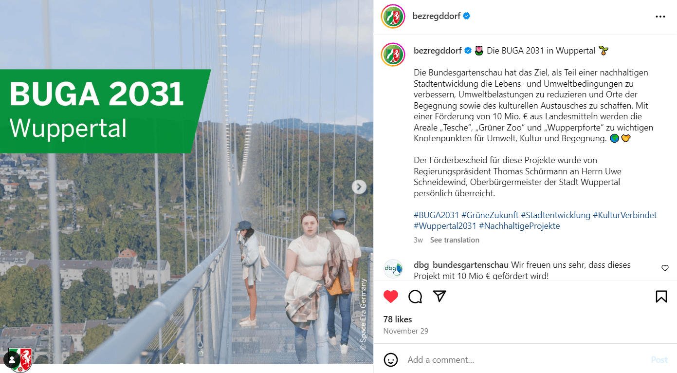 Die Bundesgartenschau (BUGA) 2031 ist eine visionäre Initiative, die darauf abzielt, eine nachhaltige Stadtentwicklung in Wuppertal zu fördern. Das Projekt konzentriert sich auf die Verbesserung der Lebens- und Umweltbedingungen, die Reduzierung von Verschmutzung und die Schaffung lebendiger Räume für Kultur und Gemeinschaftsaustausch. Wichtige Entwicklungsbereiche umfassen: Tesche: Umwandlung ehemaliger Industriegebiete in Parklandschaften mit Erholungs- und Begegnungsräumen für den Stadtteil Vohwinkel. Grüner Zoo: Revitalisierung eines historischen Landschaftsparks zu einem Raum für den Erhalt der Biodiversität und Innovation. Wupperpforte: Gestaltung eines "Waldes der Zukunft", der Landschaftsinnovation mit ökologischem Erhalt integriert. Das Projekt setzt neue Maßstäbe in der Naturbildung, Zugänglichkeit und Kreislauffähigkeit und schafft eine grünere, inklusivere Zukunft für die Stadt.